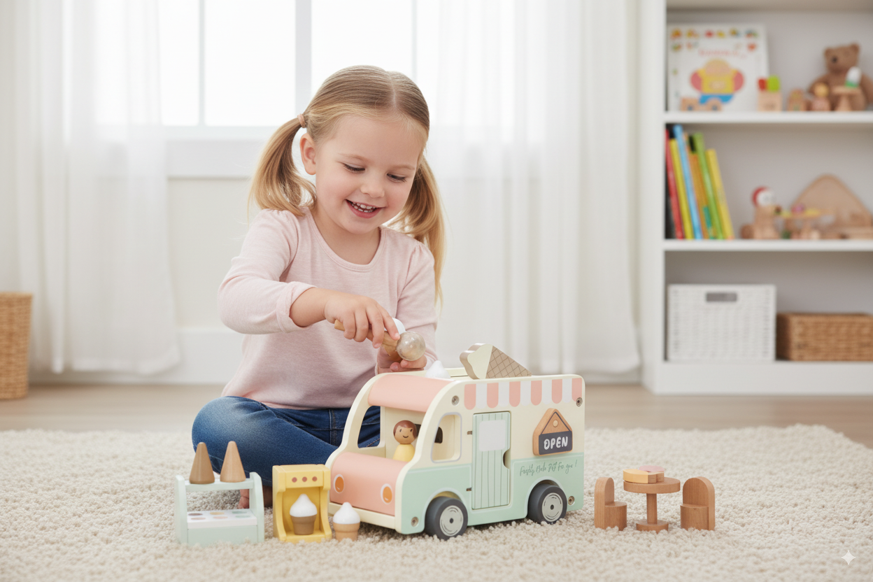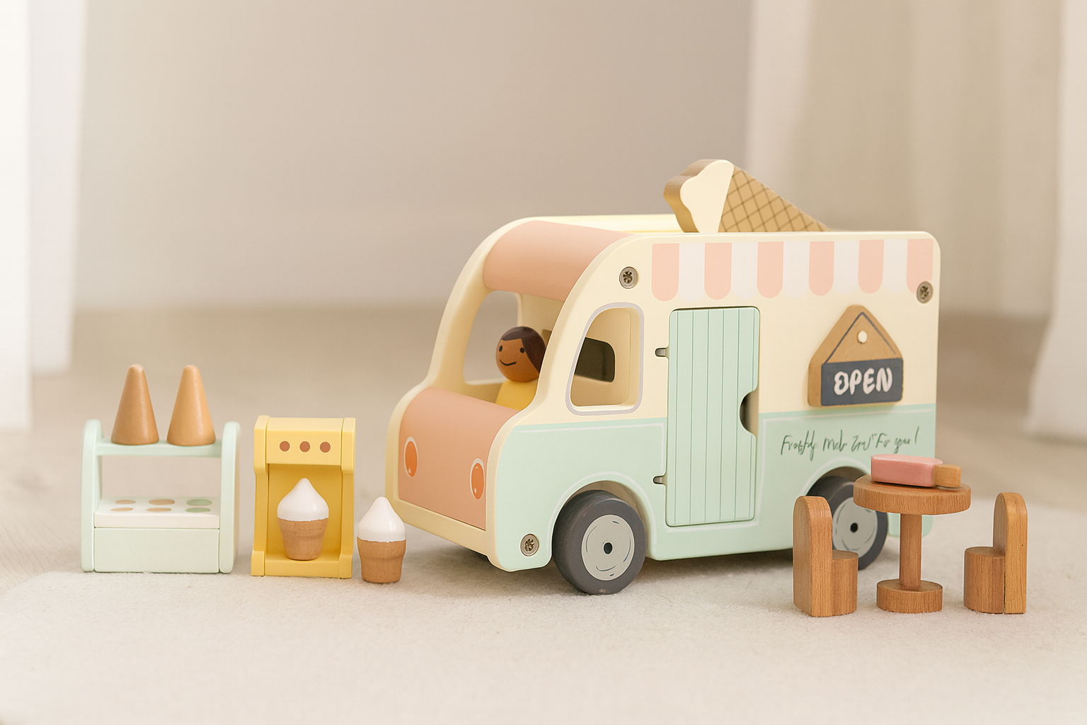 Feito em madeira de alta qualidade e com acabamento delicado, este brinquedo estimula a imaginação, a coordenação motora e o faz de conta, convidando as crianças a criarem suas próprias histórias cheias de sabor e criatividade.