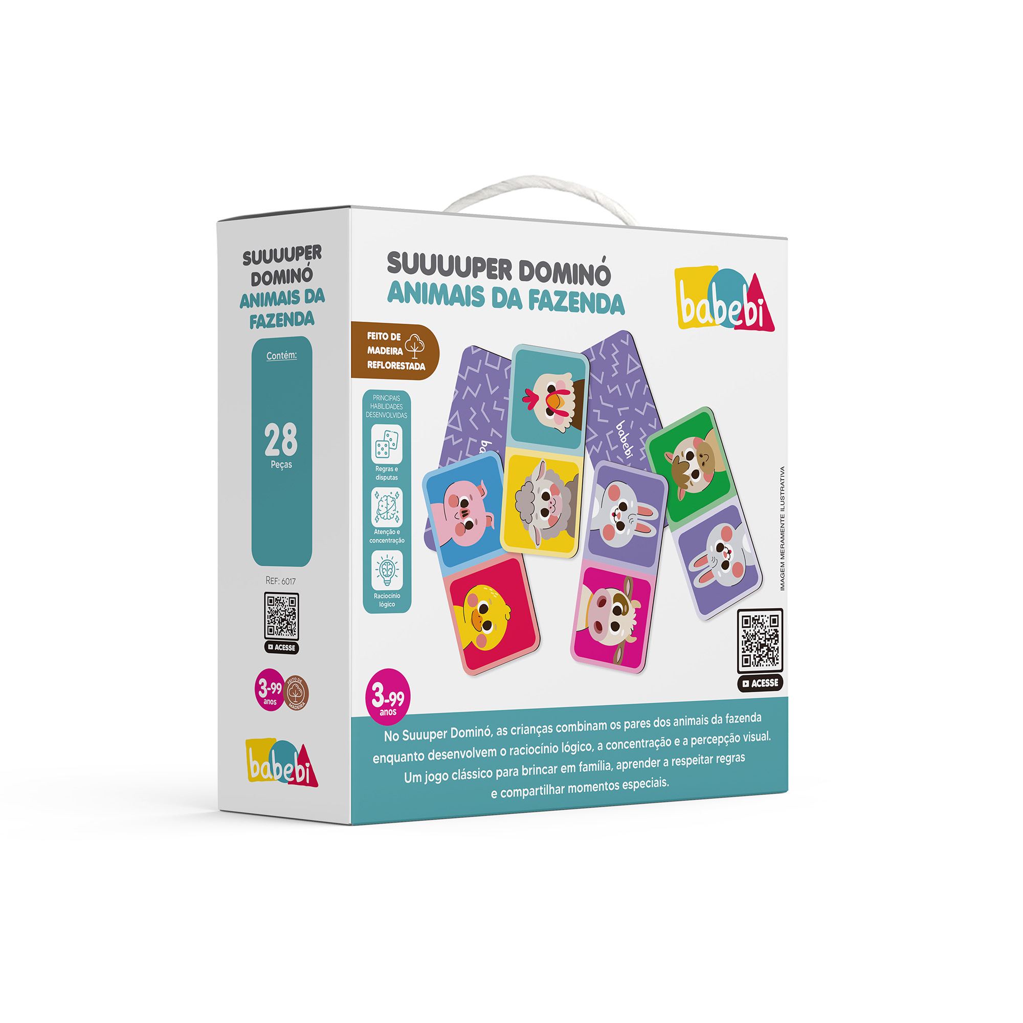Combine os pares dos animais da fazenda. O primeiro jogador a se livrar de todas as peças é o ganhador. Combinando e montando o dominó, as crianças treinam a percepção, concentração e raciocínio lógico. Trabalha o ganhar e perder de forma positiva. Brincar juntos garante muita diversão e estimula a interação social.