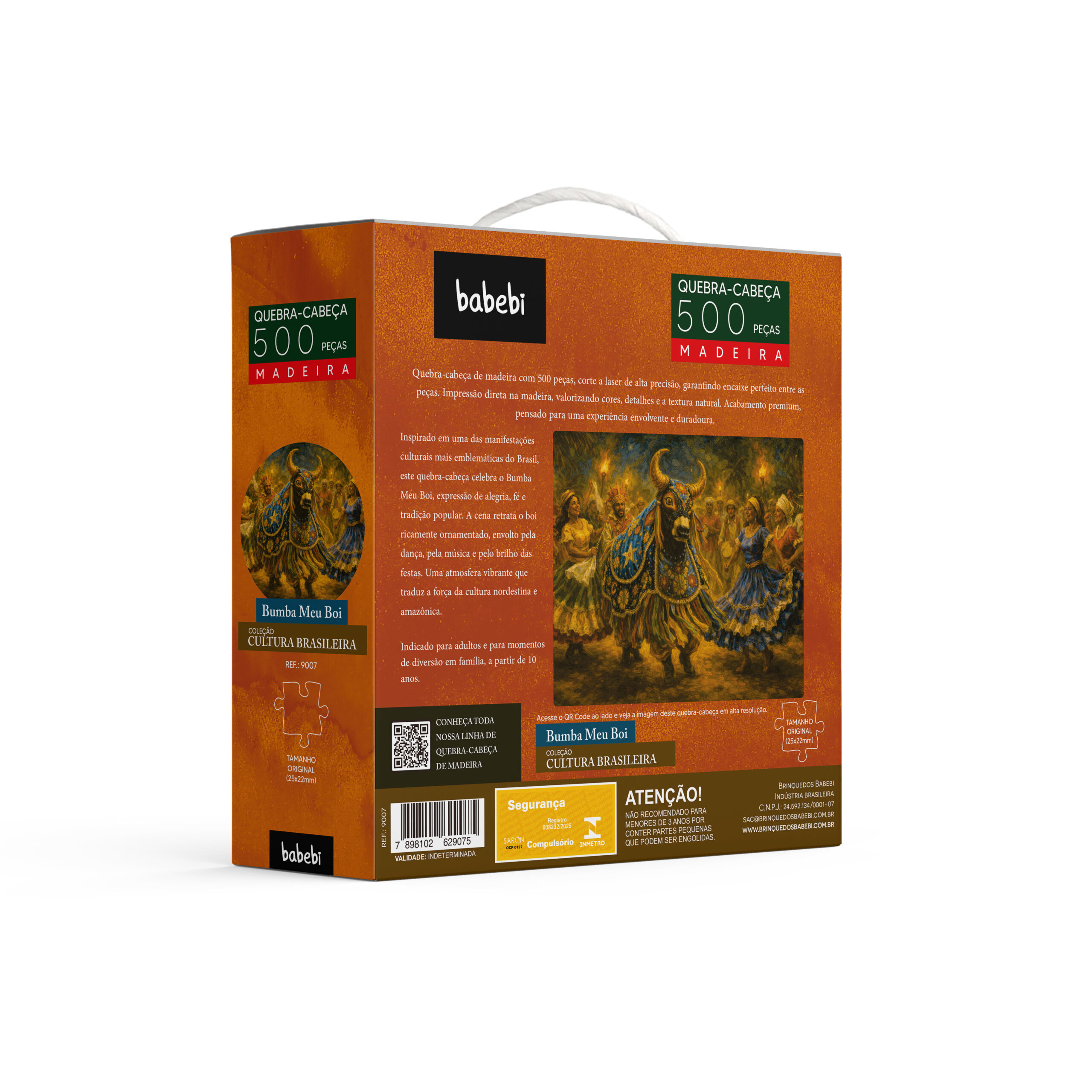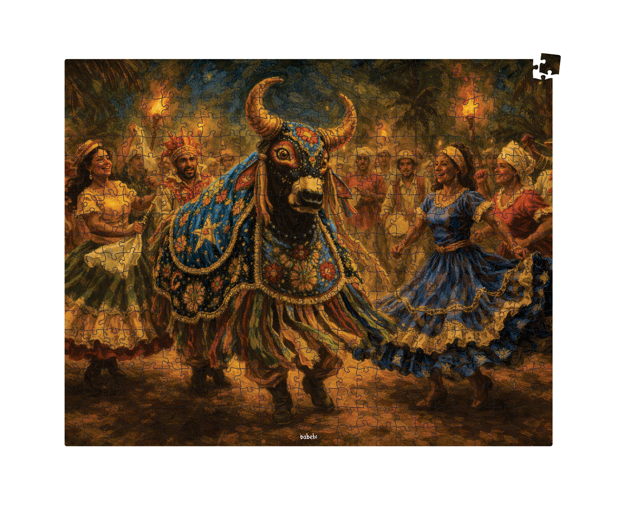 Inspirado em uma das manifestações culturais mais emblemáticas do Brasil, este quebra-cabeça celebra o Bumba Meu Boi, expressão de alegria, fé e tradição popular. A cena retrata o boi ricamente ornamentado, envolto pela dança, pela música e pelo brilho das festas, em uma atmosfera vibrante que traduz a força cultural do Norte e Nordeste do país.