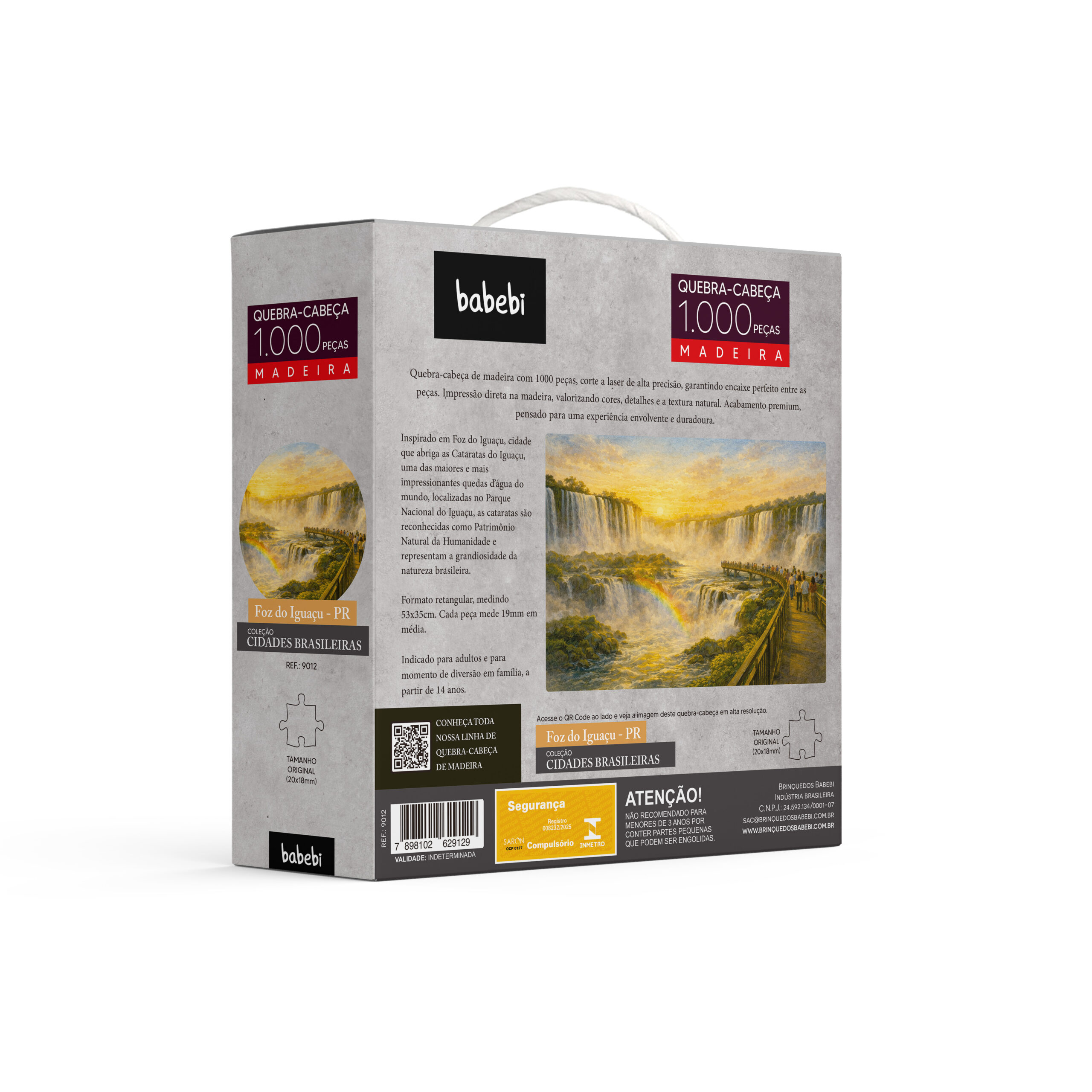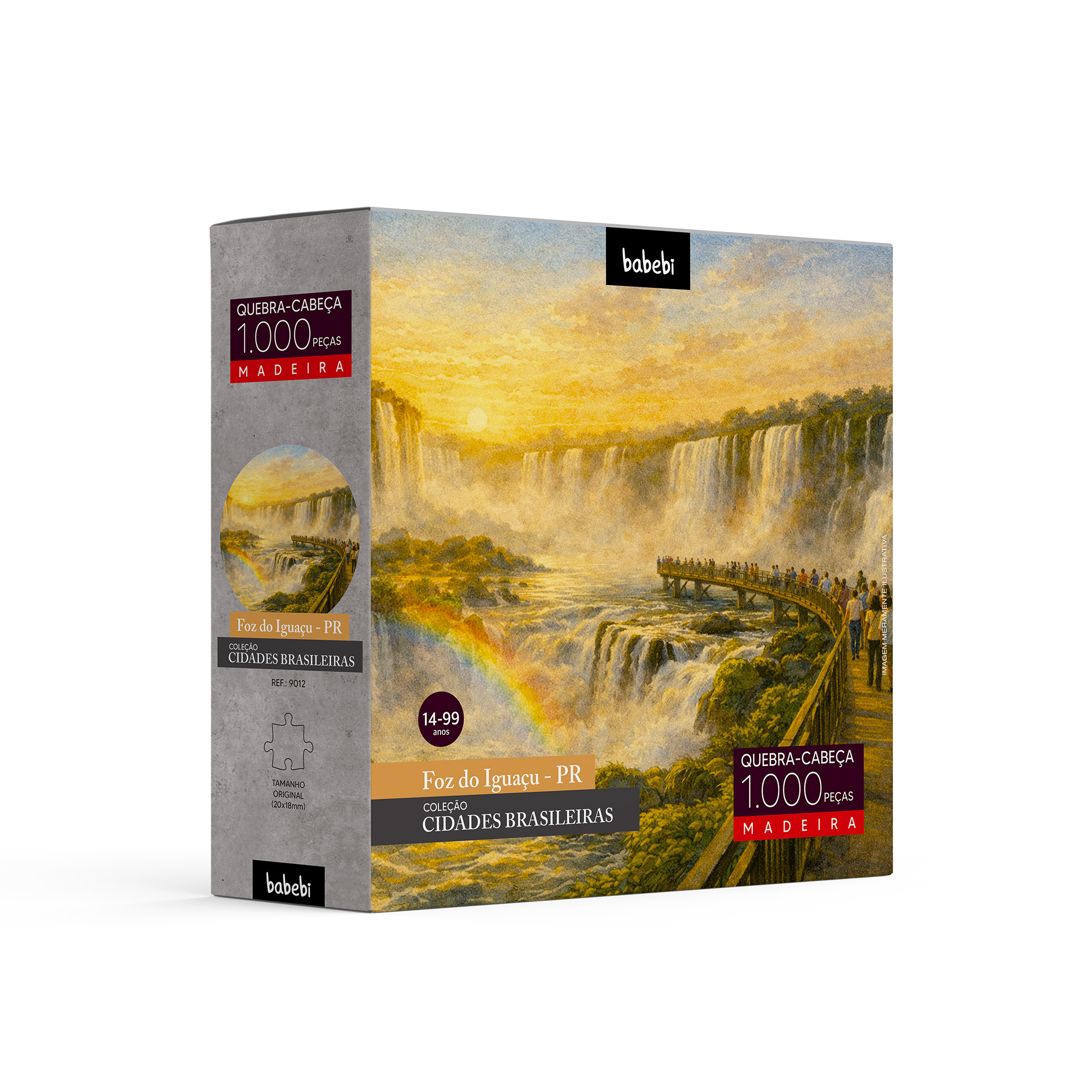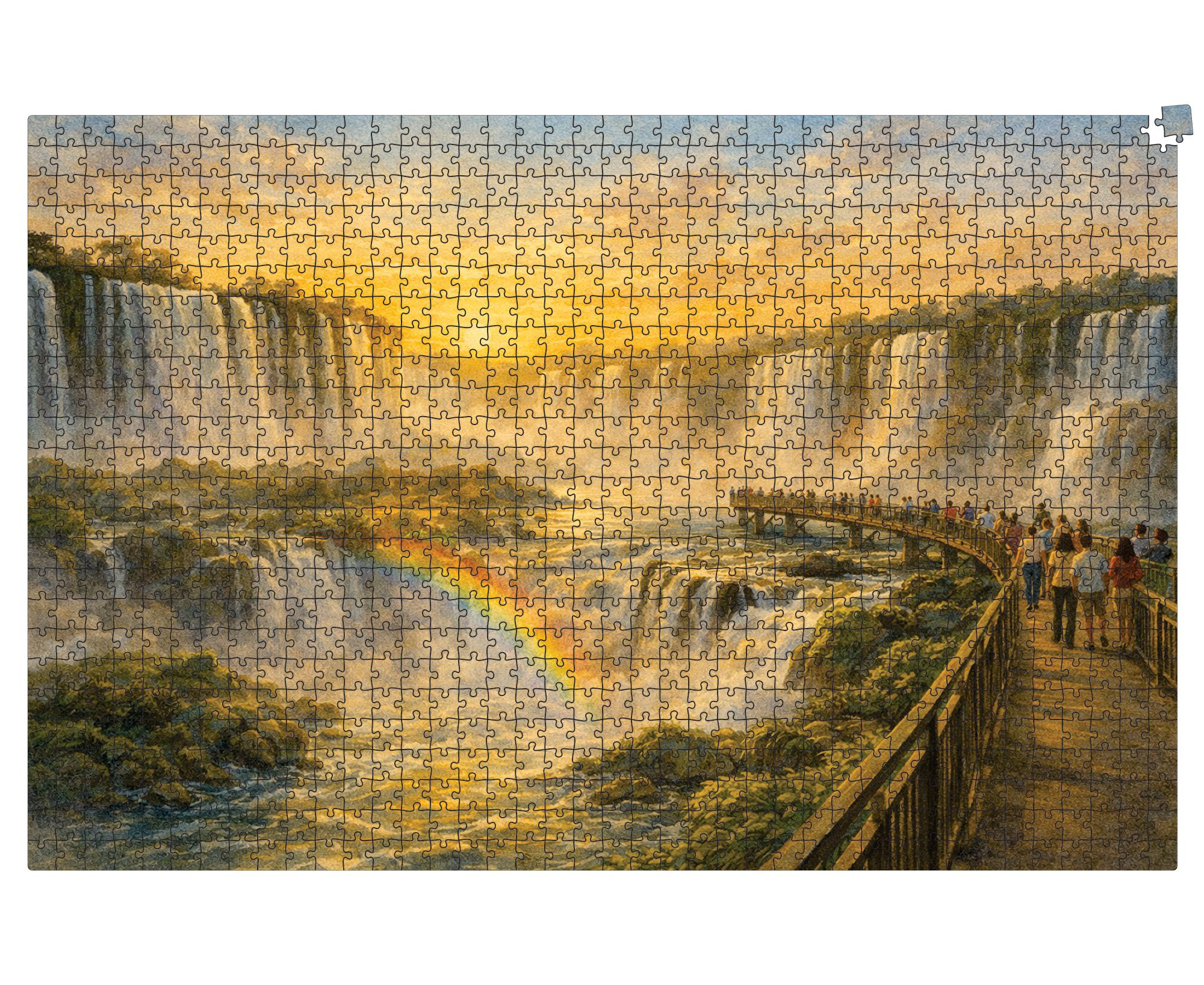 Inspirado em uma das paisagens naturais mais impressionantes do mundo, este quebra-cabeça retrata as Cataratas do Iguaçu sob um céu iluminado pelo pôr do sol. A cena revela a grandiosidade das quedas d’água, a névoa que sobe das corredeiras e o arco-íris que nasce entre luz e movimento.