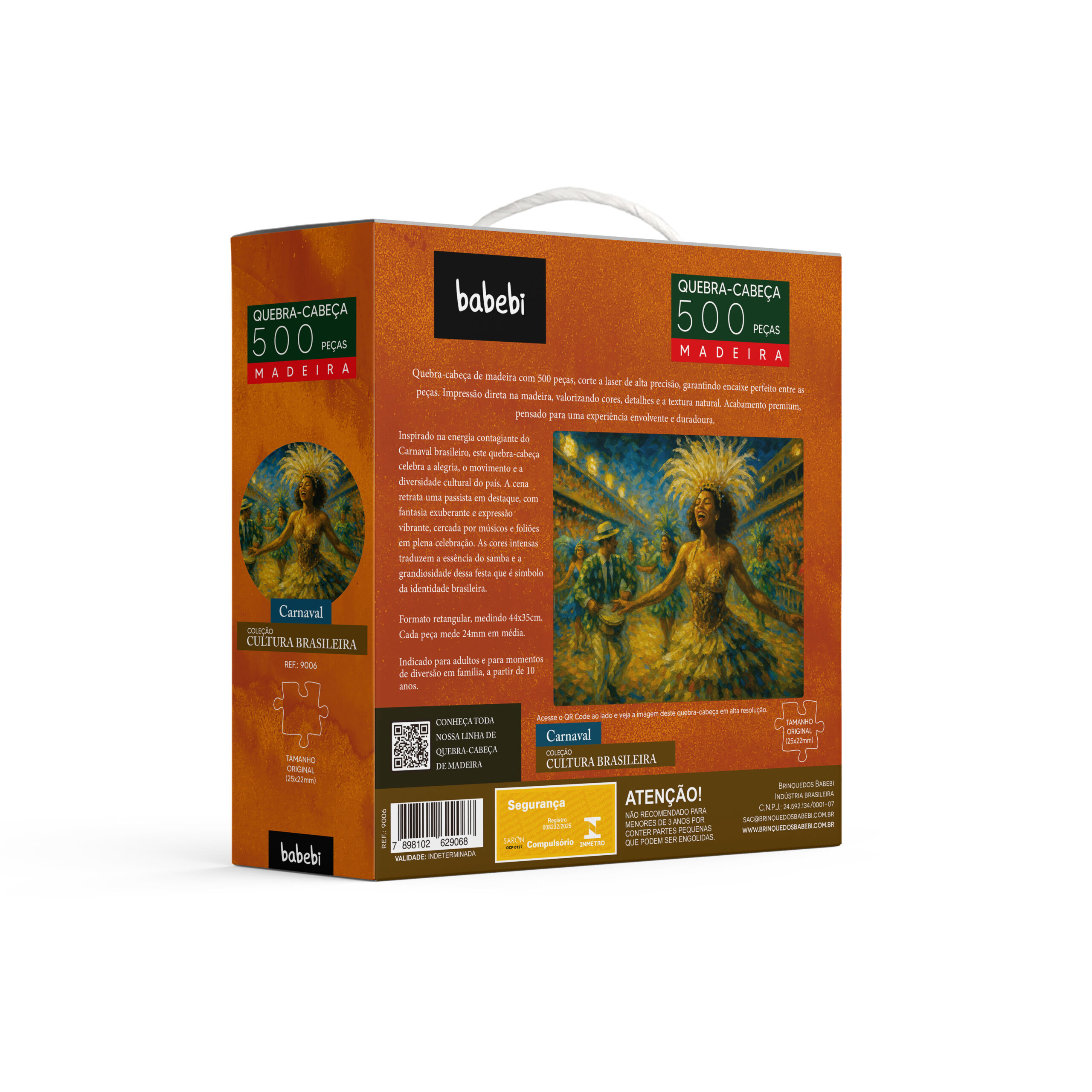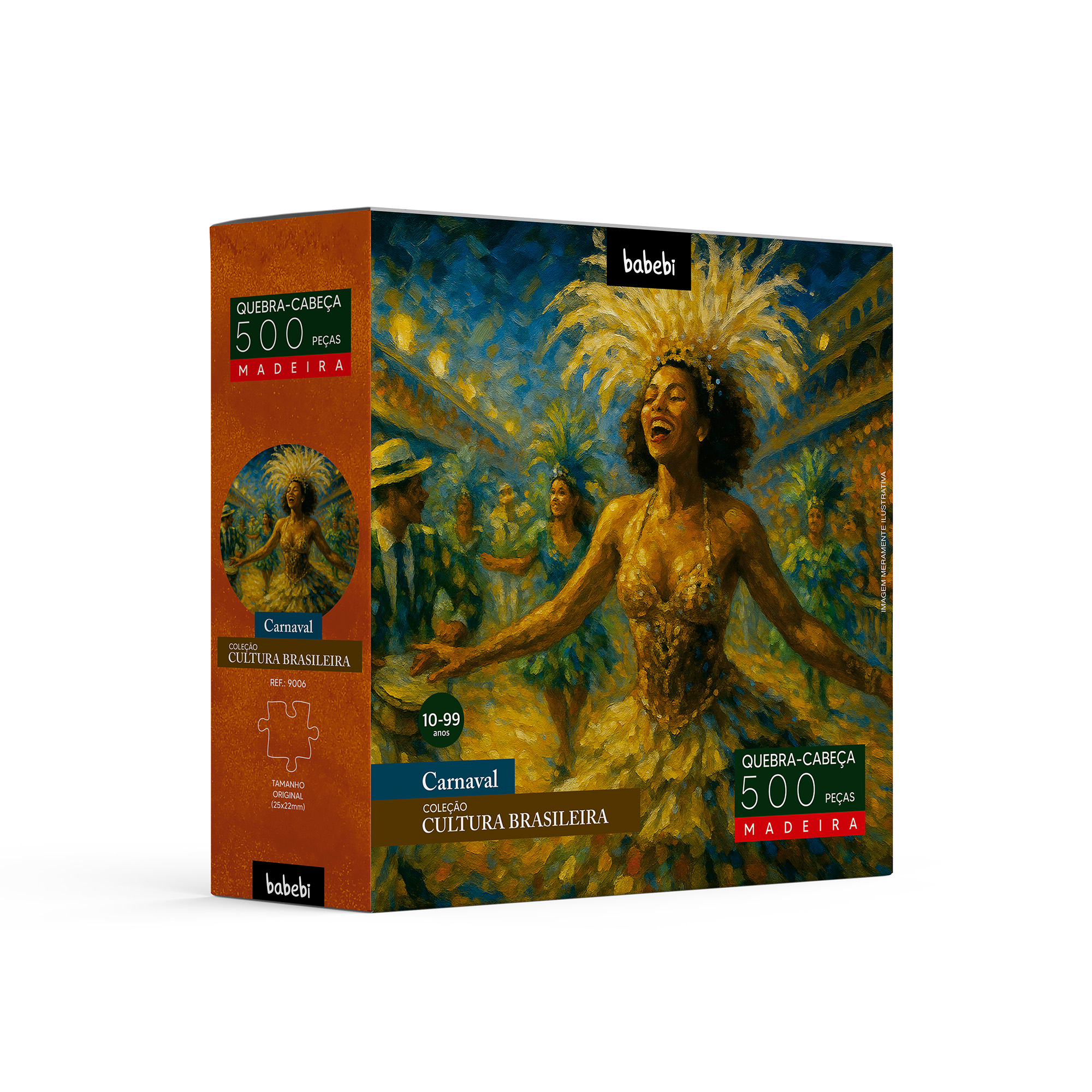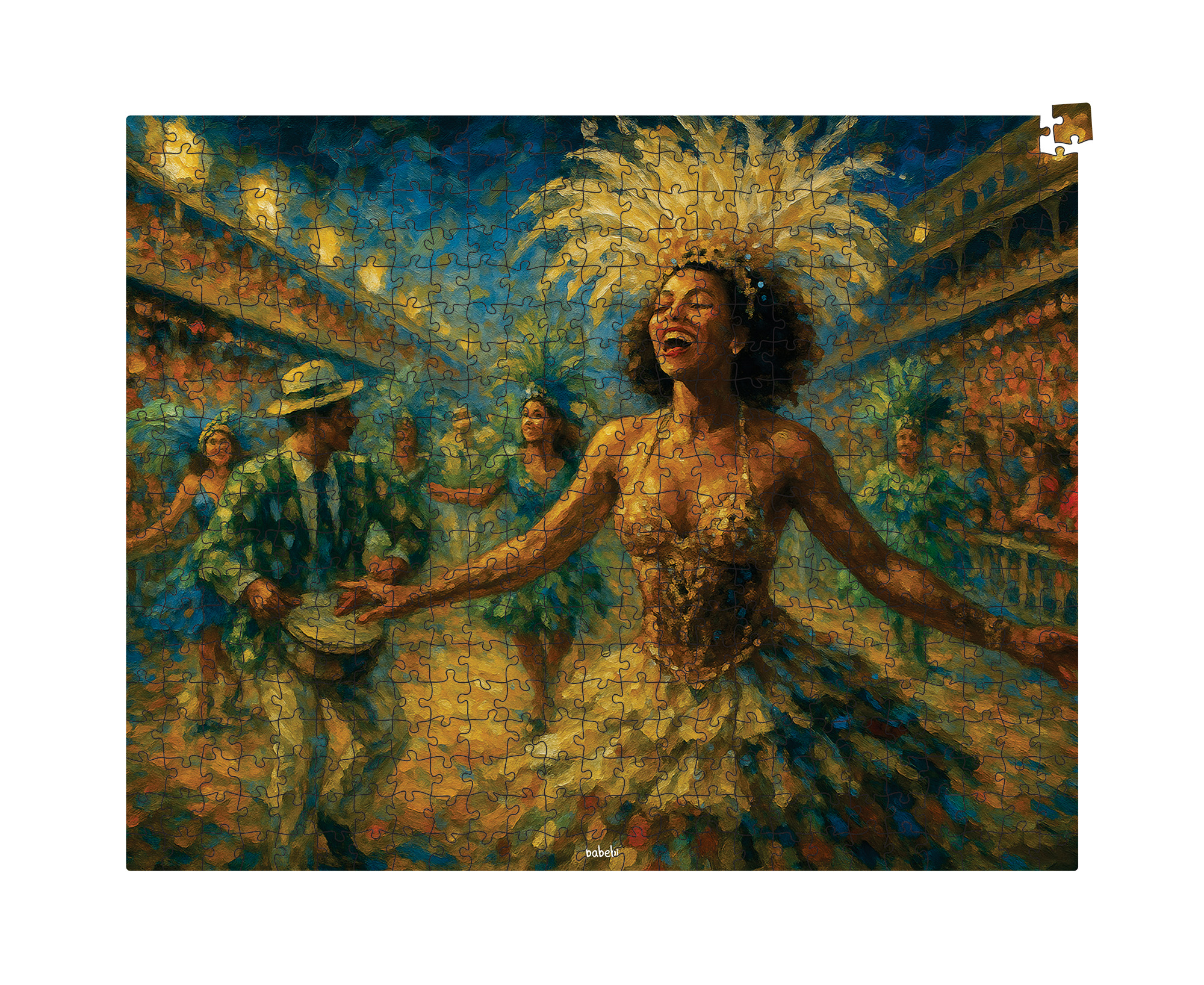 Inspirado na energia vibrante do Carnaval brasileiro, este quebra-cabeça celebra a alegria, o movimento e a diversidade cultural do país. A cena retrata uma passista em destaque, com fantasia exuberante e expressão radiante, cercada por músicos e foliões em plena celebração.